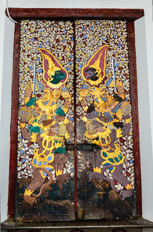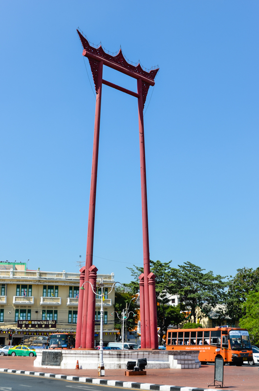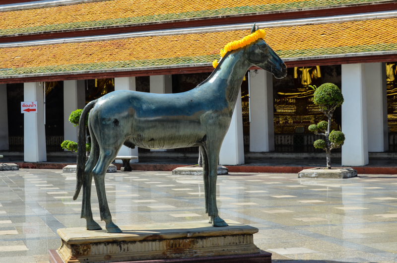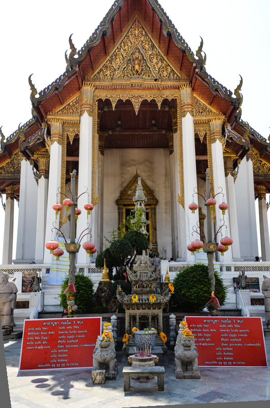 Wat Suthatthepwararam with the Brahmin monument commonly known as The Giant Swing (Sao Ching Cha) located just outside the temple in the center of the round-about on Bamrung Mueang Road . The temple is commonly known as Wat Suthat and can be found directly opposite the giant red swing which is easily seen from a distance. The temple is surrounded by chinese style pagodas. The two main buildings in the complex of Wat Suthat are the Viharn and the Phra Ubosot. The murals in the Viharn depict the previous 28 lives of the Buddha. There is a magnificient surrounding gallery around the Viharn with 156 sitting Buddhas.
