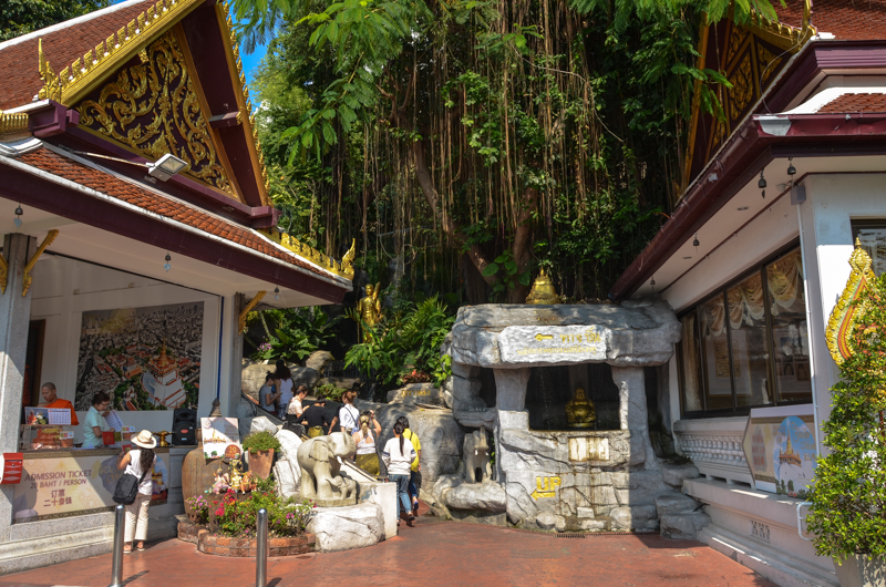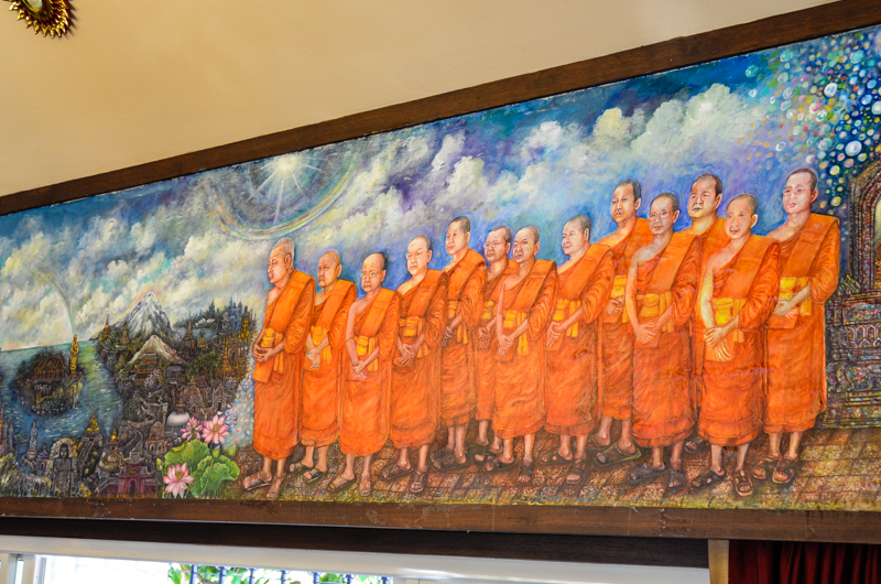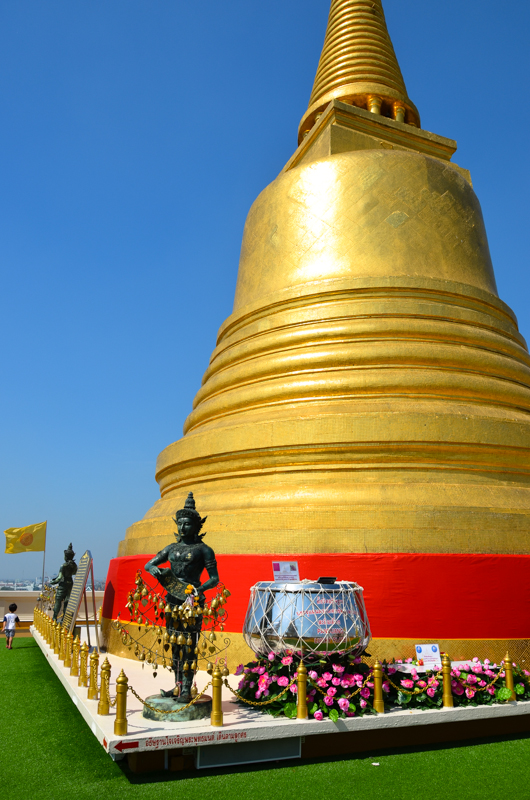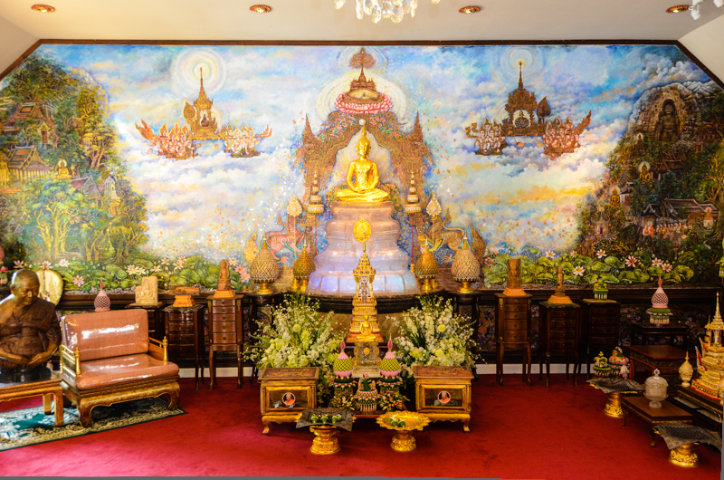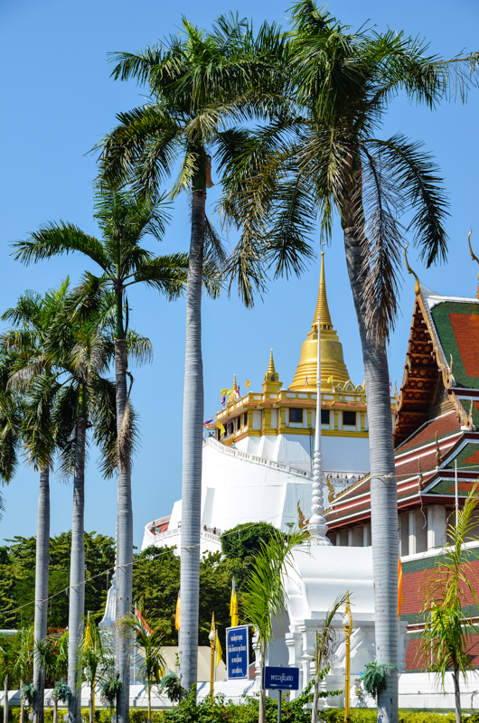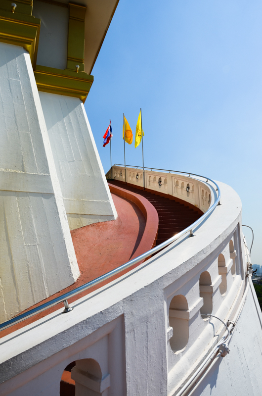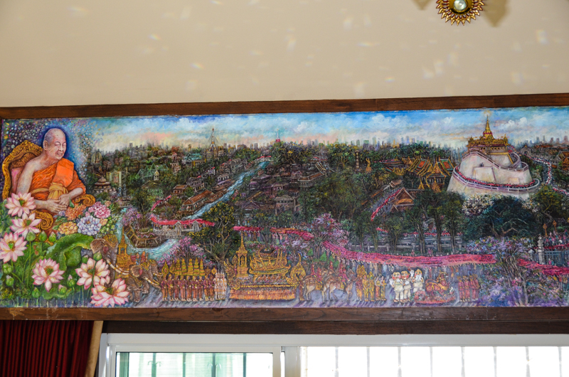 Wat Saket in Bangkok also commonly known as The Golden Mount Temple. The official name being Wat Saket Ratcha Wora Maha Wihan. The mural above depicts the annual procession held every November up to the Chedi during the full moon. The festival is held for 9 days. You can reach to the top where it has expansive views of Bangkok. It is a large complex with many other buildings at the base of the mount. Opening times are 8:00am until 5:30pm.