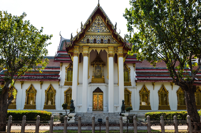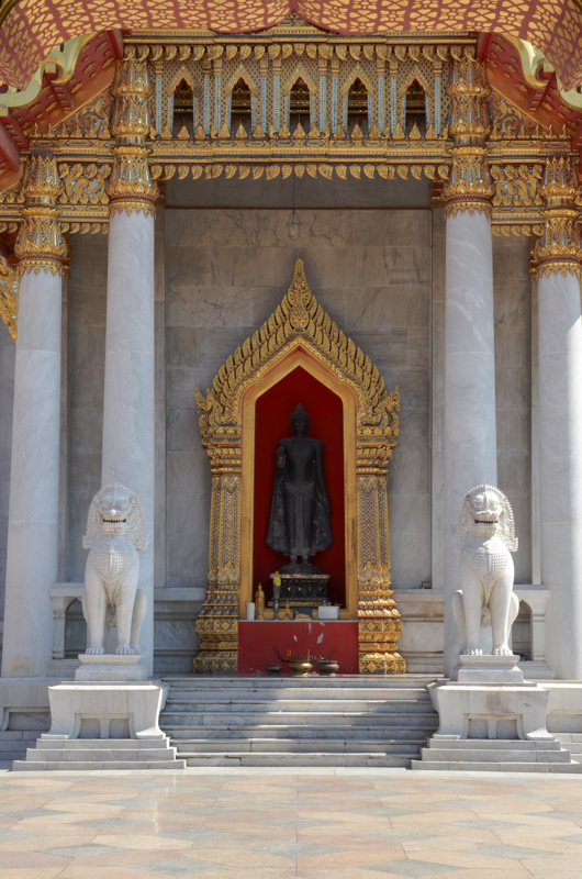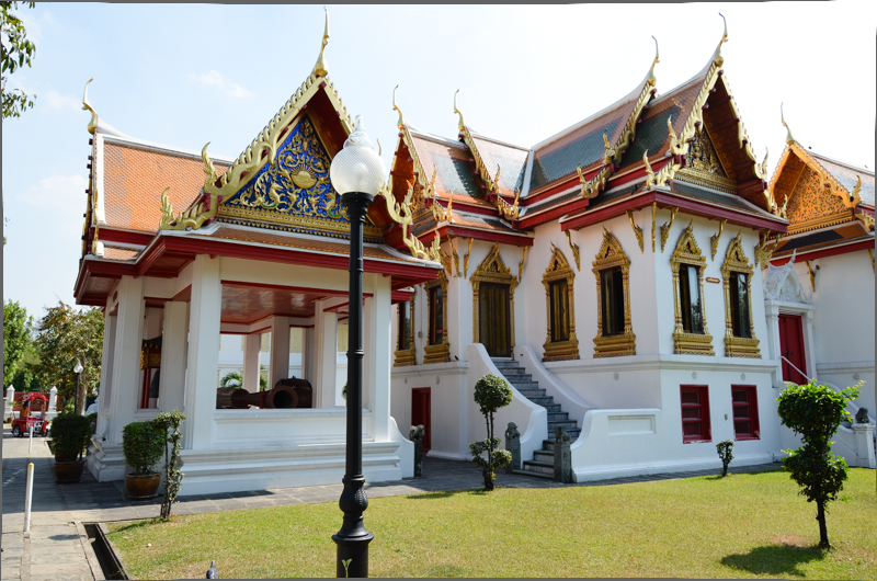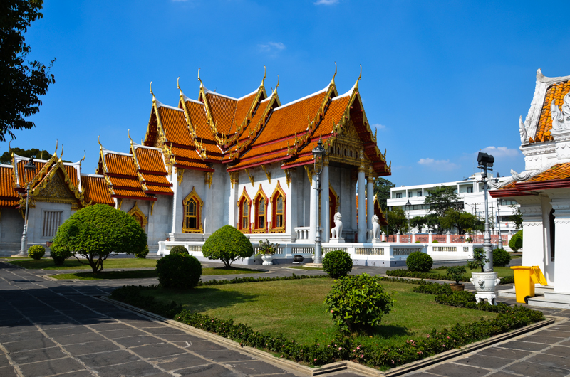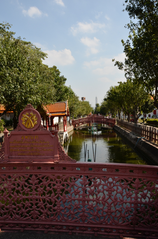 Wat Benchamabophit Dusitwanaram Ratchaworawiharn commonly known as The Marble Temple. There is also other temples just over the small red bridges that span the canal beside the temple. This temple is located on the corner of Thanon Si Ayutthaya road and Rama V road beside Prem Prachakon canal. Take the BTS Skytrain to Phaya Thai station and then a tuk-tuk, in a westerly direction, on Thanon Si Ayutthaya road which is slightly north of the skytrain station.