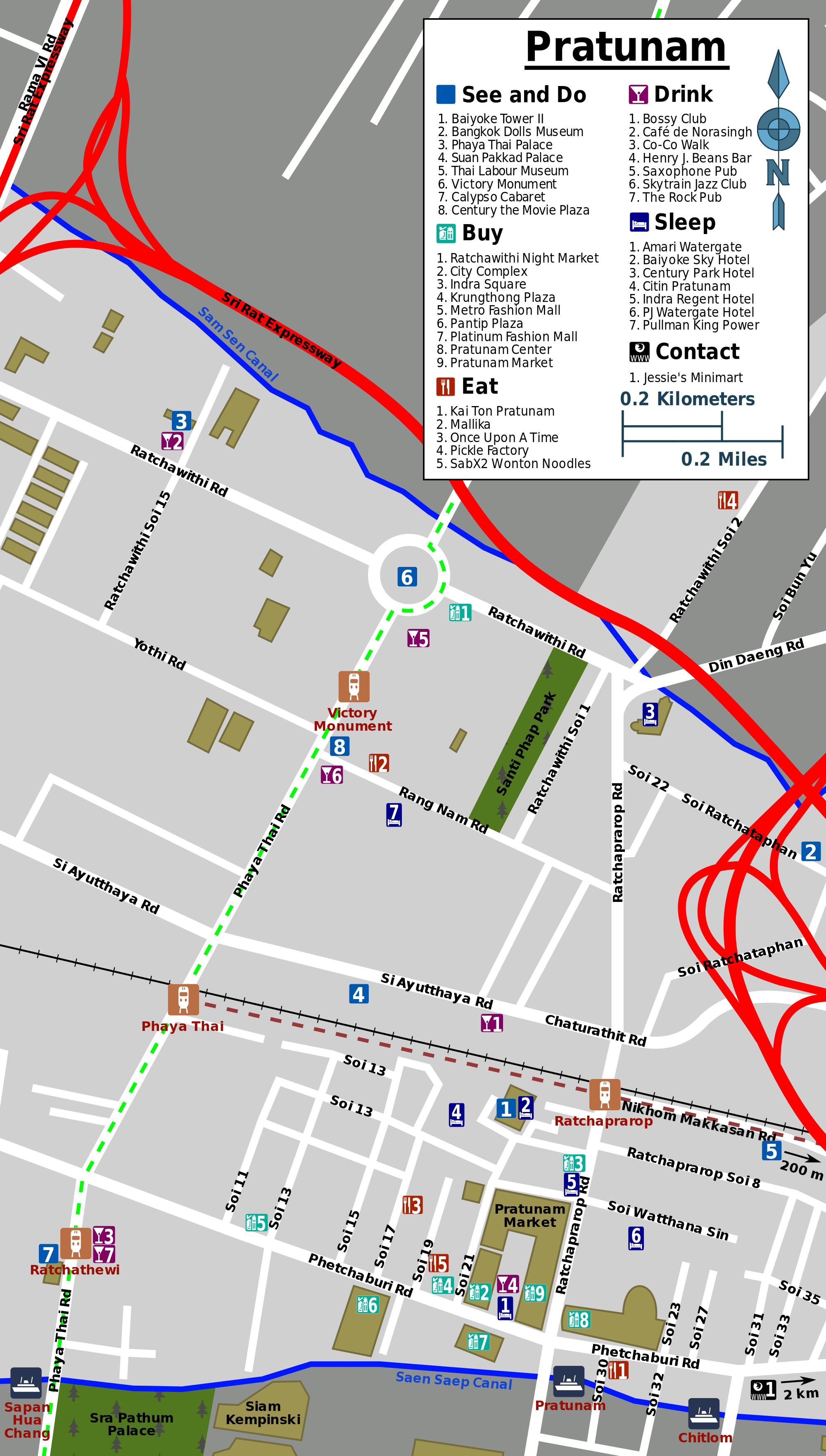 This tour map of the Pratunam district in Bangkok has the Phaya Thai Palace, Bangkok Dolls Museum, Victory Monument, Ratchawithi Night Market, Pratunam Market, Pantip Plaza, and many other shopping malls, restaurants clubs and bars, and places to stay.