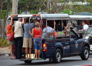 Large Songtaew's take about 10 to 12 people, depending how many slim locals or fat "farangs" are seated. They are cheap and a short ride of around 10 to 15 minutes (or longer in slow traffic) should only cost 30 baht (each) at the most. "Farangs" can get charged more but you must ask the price first. If you are told 100 baht or something ridiculous then just walk away and pick another tuk-tuk or songtaew. I travel with my Thai wife, so i only pay what the locals pay because i give her the money to pay the driver. The driver will not depart until the songtaew is full, so you may be waiting for a while. Songtaew's have distinct routes when ferrying around the locals and tourists, so you need to ask. The more remote cities with not so many tourists sometimes have smaller songtaews and tuk-tuks designed with a lower roof to accommodate the locals average height.